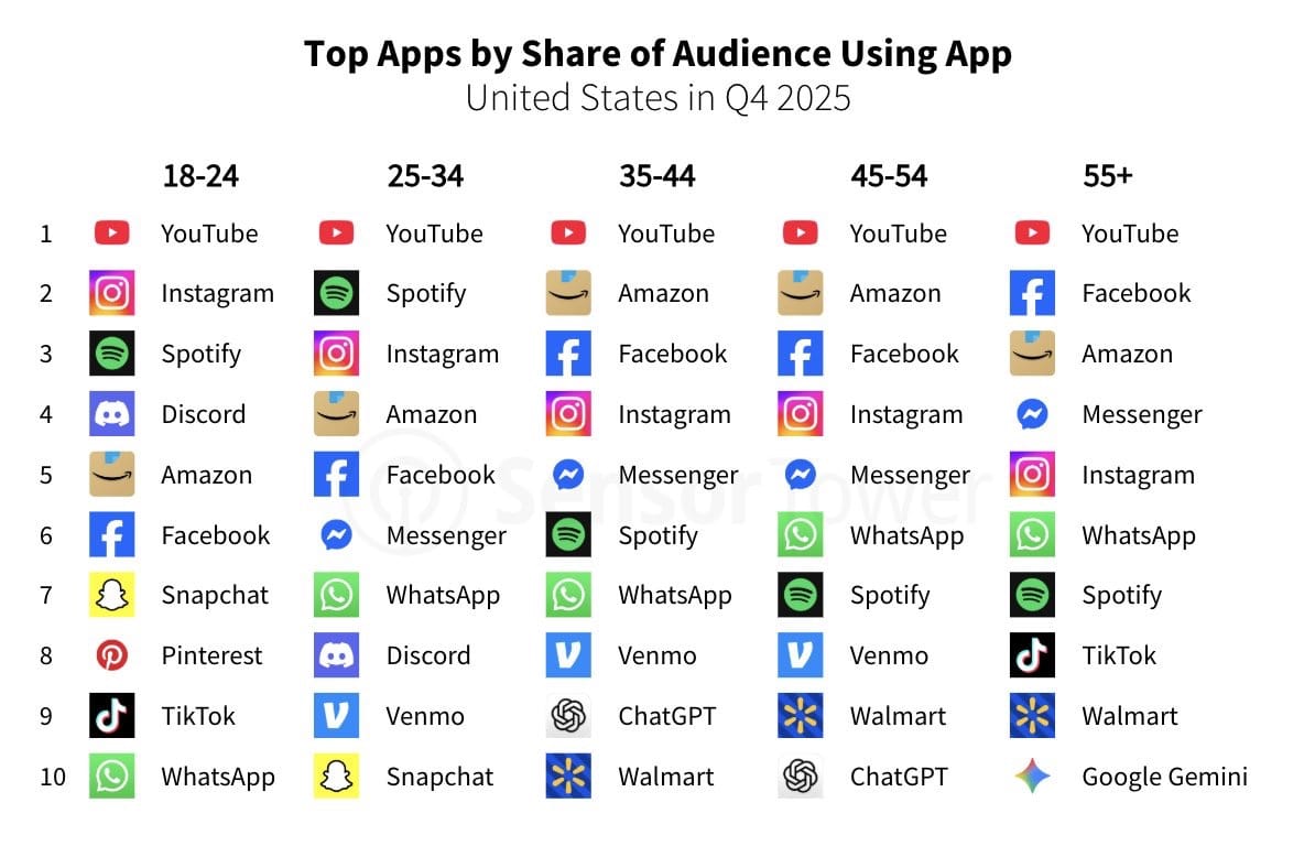 Here’s a snapshot look at the top apps downloaded in December in the US in Q4. If you notice, there is a trend: utility apps and social apps dominate the downloads & usage, not specifically AI apps. I make this point as there is a huge thing made about AI, but this shows how, despite AI features being baked in, people want to be connected and what features they want to use their most personal devices for.